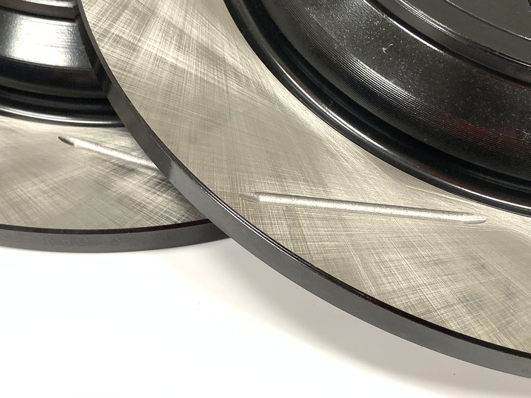 Most StopTech Sport Rotors are finished with black e-coating on both sides of the hat, inside the cooling vanes, and on the outside edge. E-coating is a superior electro-statically applied finish designed to withstand 400 hours of salt water exposure without rusting. This is especially important on both mounting faces of the hat where it touches the hub flange and back face of the wheel. Any accumulation of rust in these area can lead to installed lateral run out issues.